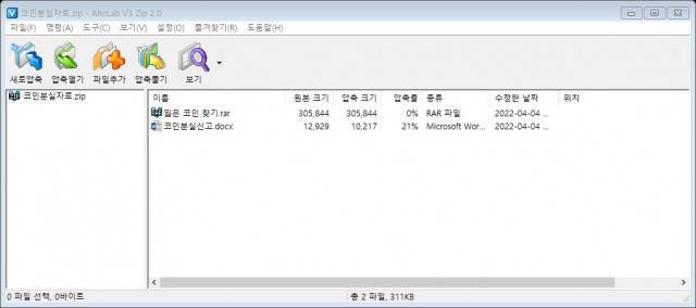 공격자는 메일 등으로 ‘코인분실자료.zip’라는 제목의 압축파일을 유포했다. 압축파일에는 ‘잃은 코인 찾기.rar’라는 압축파일과 ‘코인분실신고.docx’라는 제목의 문서파일 등 2개의 파일이 포함됐다.
