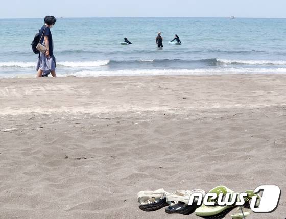 (제주=뉴스1) 오현지 기자 = 낮 최고기온이 26도에 육박한 18일 오후 제주시 삼양동 검은모래해변에서 관광객과 도민들이 더위를 식히고 있다. 2022.5.18/뉴스1