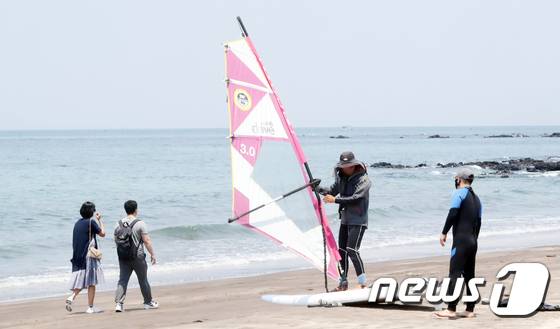 (제주=뉴스1) 오현지 기자 = 낮 최고기온이 26도에 육박한 18일 오후 제주시 삼양동 검은모래해변에서 관광객과 도민들이 더위를 식히고 있다. 2022.5.18/뉴스1