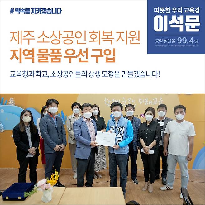 이석문 후보는 17일 제주도소상공인연합회와 간담회를 갖고 "제주 소상공인들의 회복과 지역 경제 활성화를 위해 교육청·학교에서 온라인 구매를 최소화하고 소상공인 업체 물품을 우선 구입하겠다"고 밝혔다.
