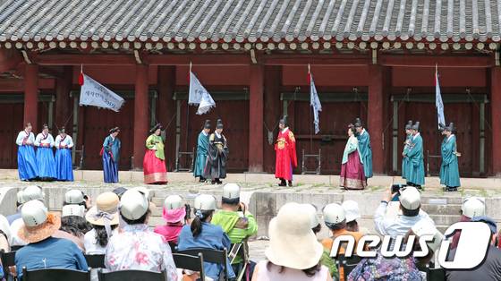 (서울=뉴스1) 장수영 기자 = 18일 서울 종로구 종묘 영녕전에서 시민들이 묘현례 재현 행사에 앞서 창작극을 관람하고 있다.