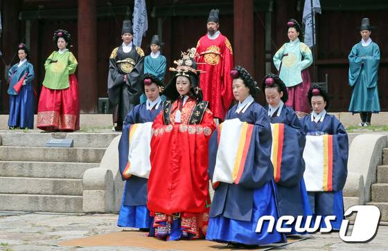 (서울=뉴스1) 장수영 기자 = 18일 서울 종로구 종묘 영녕전에서 묘현례가 재현되고 있다.