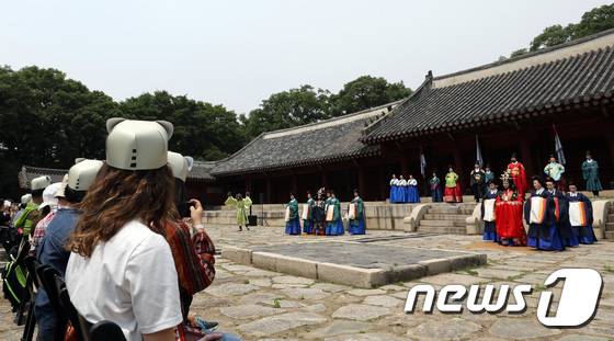 (서울=뉴스1) 장수영 기자 = 18일 서울 종로구 종묘 영녕전에서 시민들이 묘현례 재현 행사를 관람하고 있다.