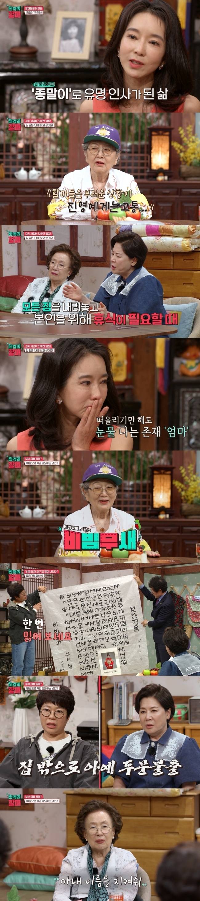 한편 ‘종말이’ 곽진영이 “김치 사업을 하면서 제 일상이 없어졌다”라며 할매들의 도움을 구했다. 곽진영은 "제 이름을 걸고 시작한 사업이라 너무 부담감이 크다. 제 손이 안 닿는 부분이 없다"며 하소연했다. 김치 사업도, ‘종말이’를 보기 위해 찾아오는 사람들도 곽진영에겐 스트레스였다. 이에 박정수는 "쉬질 못하니 번아웃이 온 것 같다. 병원에 가자"라며 마음을 치료하길 권했다. 곽진영은 어머니와도 자주 부딪힘이 있다는 사실을 밝히며 결국 눈물을 터뜨렸다. 어머니에 대한 마음의 짐까지 진 곽진영에 박정수는 “사람이 일에 지치면 그런 마음이 든다”며 너무 조급해하지 말고 마음의 여유를 찾아가길 응원했다.