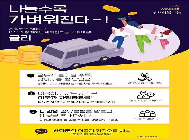 경기 부천시는 스마트시티 챌린지사업의 일환으로 차량공유 서비스 기업인 위굴리(주)와 함께 시민이 주도하는 행복나눔형 차량공유서비스를 개시하고 공유차의 주 이용자를 모집한다고 18일 밝혔다.