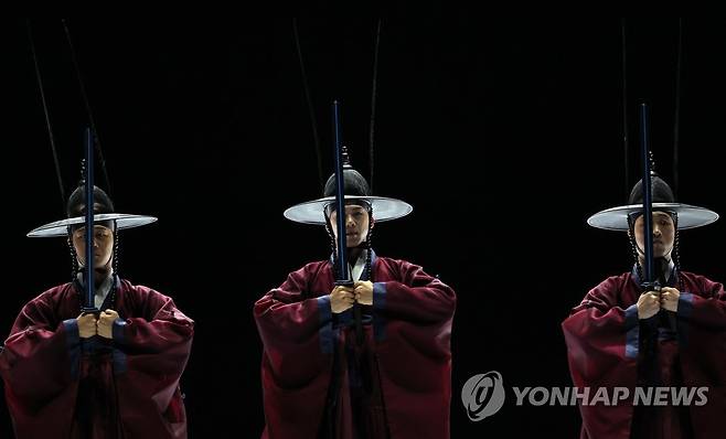 (서울=연합뉴스) 김인철 기자 = 18일 오후 서울 종로구 세종문화회관에서 열린 '일무' 프레스콜에서 서울시무용단이 공연을 하고 있다.
