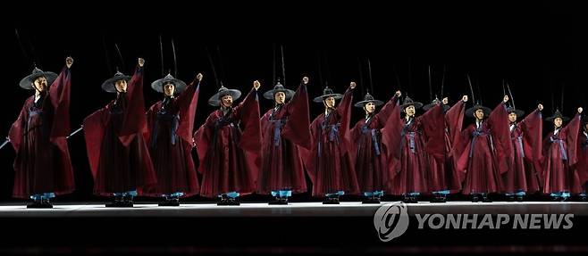 (서울=연합뉴스) 김인철 기자 = 18일 오후 서울 종로구 세종문화회관에서 열린 '일무' 프레스콜에서 서울시무용단이 공연을 하고 있다.