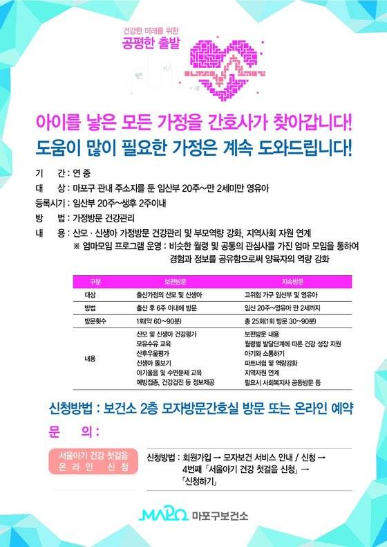 자세한 사항은 마포구 보건소 모자건강센터로 전화하면 안내 받을 수 있다.