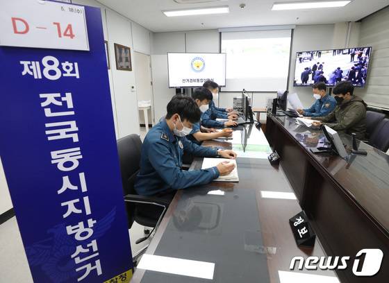 (수원=뉴스1) 김영운 기자 = 경기남부경찰청 선거통합경비상황실 운영이 시작된 18일 경기 수원 팔달구 경기남부경찰청 선거통합경비상황실에서 담당 직원들이 업무를 보고 있다.