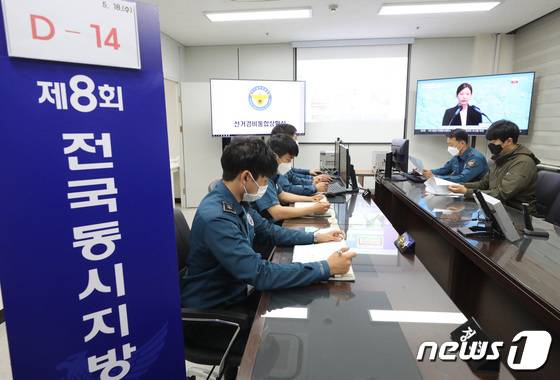(수원=뉴스1) 김영운 기자 = 경기남부경찰청 선거통합경비상황실 운영이 시작된 18일 경기 수원 팔달구 경기남부경찰청 선거통합경비상황실에서 담당 직원들이 업무를 보고 있다.