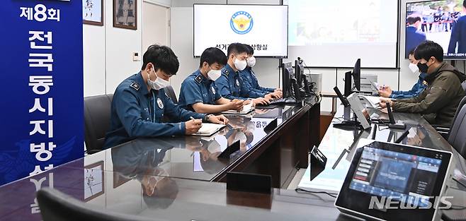 [수원=뉴시스] 김종택기자 = 제8회 전국동시지방선거 공식선거운동을 하루 앞둔 18일 경기도 수원시 경기남부경찰청 선거경비통합상황실에서 경찰들이 근무하고 있다. 2022.05.18. jtk@newsis.com