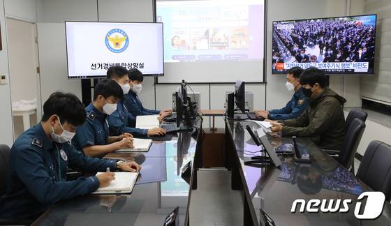 (수원=뉴스1) 김영운 기자 = 경기남부경찰청 선거통합경비상황실 운영이 시작된 18일 경기 수원 팔달구 경기남부경찰청 선거통합경비상황실에서 담당 직원들이 업무를 보고 있다.