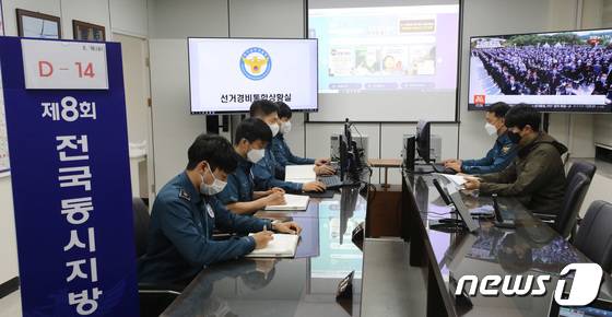 (수원=뉴스1) 김영운 기자 = 경기남부경찰청 선거통합경비상황실 운영이 시작된 18일 경기 수원 팔달구 경기남부경찰청 선거통합경비상황실에서 담당 직원들이 업무를 보고 있다.