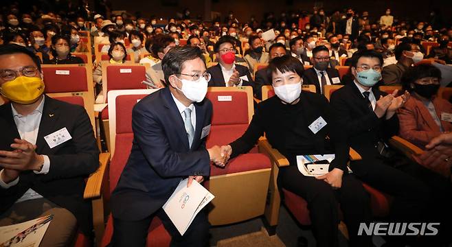 [수원=뉴시스] 추상철 기자 = 더불어민주당 김동연, 국민의힘 김은혜 경기지사 후보가 18일 오후 경기 수원시 경기아트센터에서 열린 '2022 경기도 체육인 한마당' 행사에 참석해 악수를 하고 있다. 2022.05.18. scchoo@newsis.com