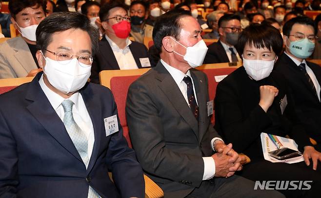 [수원=뉴시스] 추상철 기자 = 더불어민주당 김동연, 국민의힘 김은혜 경기지사 후보가 18일 오후 경기 수원시 경기아트센터에서 열린 '2022 경기도 체육인 한마당' 행사에서 이원성 경기도체육회장 양옆에 앉아 있다. 2022.05.18. scchoo@newsis.com
