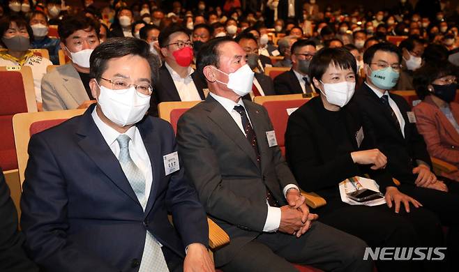 [수원=뉴시스] 추상철 기자 = 더불어민주당 김동연, 국민의힘 김은혜 경기지사 후보가 18일 오후 경기 수원시 경기아트센터에서 열린 '2022 경기도 체육인 한마당' 행사에서 이원성 경기도체육회장 양옆에 앉아 있다. 2022.05.18. scchoo@newsis.com