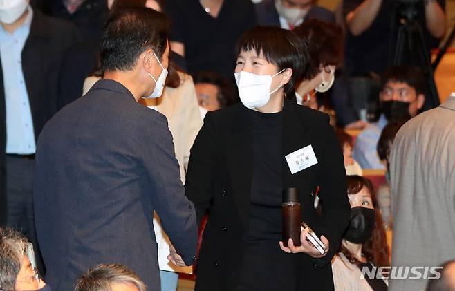 [수원=뉴시스] 추상철 기자 = 김은혜 국민의힘 경기지사 후보가 18일 오후 경기 수원시 경기아트센터에서 열린 '2022 경기도 체육인 한마당' 행사에서 참석자와 인사하고 있다. 2022.05.18. scchoo@newsis.com