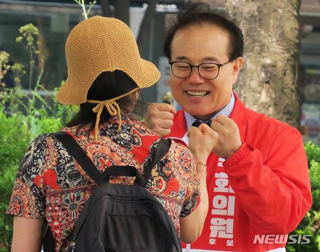 [인천=뉴시스] 김동영 기자 = 제8회 전국동시지방선거와 함께 치러지는 인천 계양을 국회의원 보궐선거에 출마한 국민의힘 윤형선 후보가 18일 오후 인천 계양구 거리에서 주민과 인사를 나누고 있다. 2022.05.18. dy0121@newsis.com