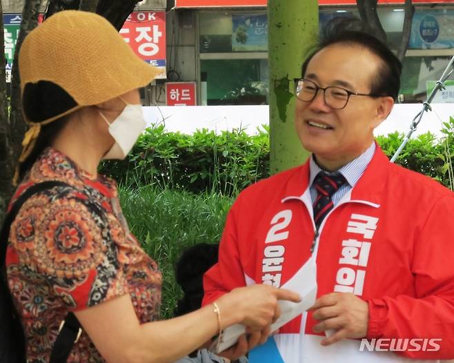 [인천=뉴시스] 김동영 기자 = 제8회 전국동시지방선거와 함께 치러지는 인천 계양을 국회의원 보궐선거에 출마한 국민의힘 윤형선 후보가 18일 오후 인천 계양구 거리에서 주민과 인사를 나누고 있다. 2022.05.18. dy0121@newsis.com