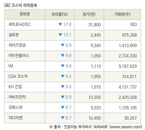 [fnRASSI]장마감, 코스닥 하락 종목(루트로닉3우C -17.8% ↓)