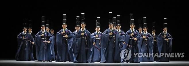 (서울=연합뉴스) 강태현 수습기자 = 18일 오후 서울 종로구 세종문화회관 대극장에서 서울시무용단 신작 '일무(佾舞)' 프레스콜 공연이 펼쳐지고 있다. '일무' 공연은 국가무형문화재이자 인류무형문화유산인 종묘제례악을 바탕으로 한다. 2022.5.18