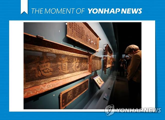 (서울=연합뉴스) 이재희 기자 = 18일 오전 서울 종로구 국립고궁박물관에서 열린 특별전 '조선의 이상을 걸다, 궁중현판' 전시간담회에서 참석자들이 조선시대 현판을 살펴보고 있다. 조선왕조 궁중 현판과 작업 도구 등 자료 100여 점을 선보이는 이번 전시는 8월 15일까지 열린다. 2022.5.18 [THE MOMENT OF YONHAPNEWS]