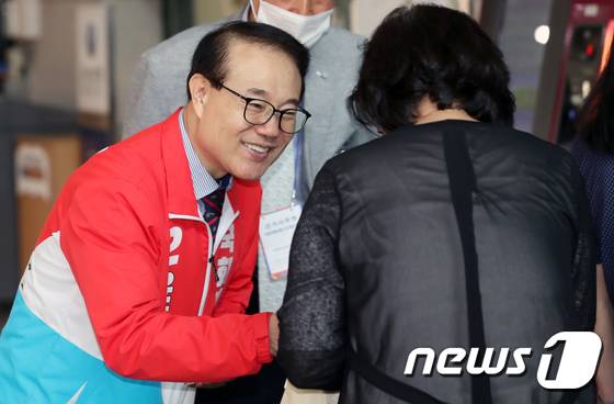 (인천=뉴스1) 정진욱 기자 = 인천 계양을 국회의원 보궐선거에 출마한 윤형선 국민의힘 후보가 18일 인천시 계양구청 앞에서 구민들에게 인사를 하고 있다. 2022.5.18/뉴스1