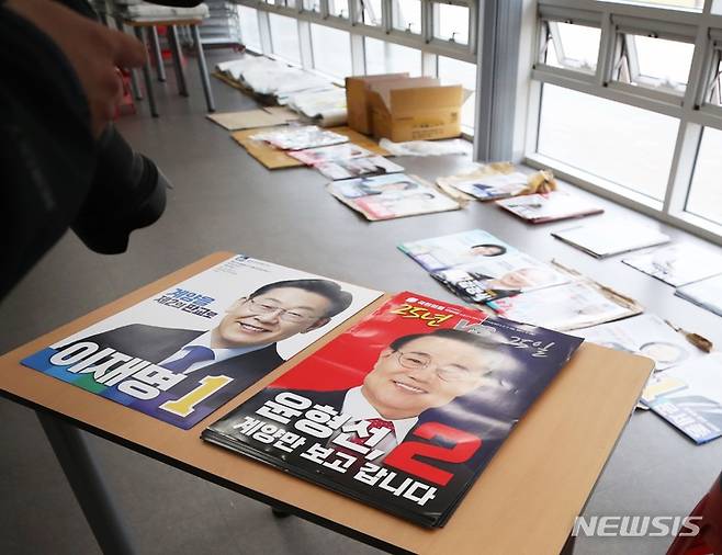 [인천=뉴시스] 김동영 기자 = 18일 오후 인천 계양구 계양경기장에서 선거관리위원회 관계자들이 제8회 전국동시지방선거와 함께 치러지는 인천 계양을 국회의원 보궐선거에 출마한 더불어민주당 이재명 후보와 국민의힘 윤형선 후보의 벽보를 공개하고 있다. 2022.5.18. dy0121@newsis.com