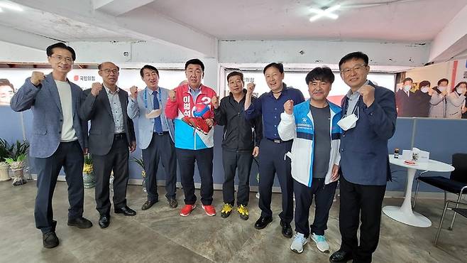 [청주=뉴시스] 임선우 기자 = 청주족구협회 임원들이 18일 국민의힘 이범석 청주시장 후보 선거사무소에서 이 후보를 지지하고 있다. 2022.05.18. imgiza@newsis.com