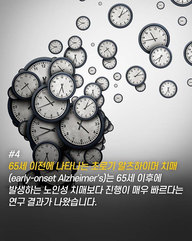 65세 이전에 나타나는 초로기(初老期) 알츠하이머 치매(early-onset Alzheimer's)는 65세 이후에 발생하는 노인성 치매보다 진행이 매우 빠르다는 연구 결과가 나왔습니다.
