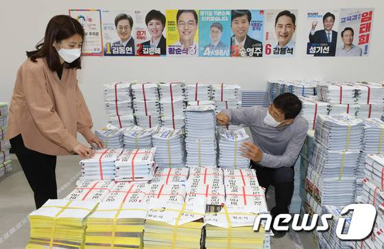 (수원=뉴스1) 김영운 기자 = 제8회 전국동시지방선거 공식 선거운동을 하루 앞둔 18일 오후 경기 수원 권선구 중앙선거관리위원회 선거연수원 선거장비센터에서 관계자들이 선거벽보와 공보물 점검을 하고 있다. 2022.5.18/뉴스1