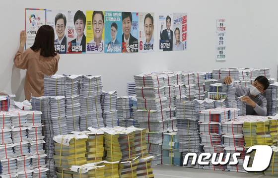 (수원=뉴스1) 김영운 기자 = 제8회 전국동시지방선거 공식 선거운동을 하루 앞둔 18일 오후 경기 수원 권선구 중앙선거관리위원회 선거연수원 선거장비센터에서 관계자들이 선거벽보와 공보물 점검을 하고 있다. 2022.5.18/뉴스1