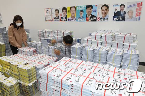 (수원=뉴스1) 김영운 기자 = 제8회 전국동시지방선거 공식 선거운동을 하루 앞둔 18일 오후 경기 수원 권선구 중앙선거관리위원회 선거연수원 선거장비센터에서 관계자들이 선거벽보와 공보물 점검을 하고 있다. 2022.5.18/뉴스1