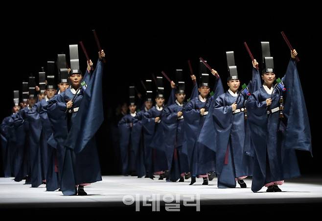 [이데일리 김태형 기자] 서울시무용단원들이 18일 서울 세종문화회관 대극장에서 열린 ‘일무’ 프레스콜에서 시연을 하고 있다.