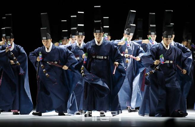 [이데일리 김태형 기자] 서울시무용단원들이 18일 서울 세종문화회관 대극장에서 열린 ‘일무’ 프레스콜에서 시연을 하고 있다.