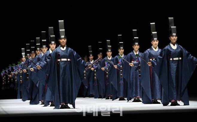 [이데일리 김태형 기자] 서울시무용단원들이 18일 서울 세종문화회관 대극장에서 열린 ‘일무’ 프레스콜에서 시연을 하고 있다.
