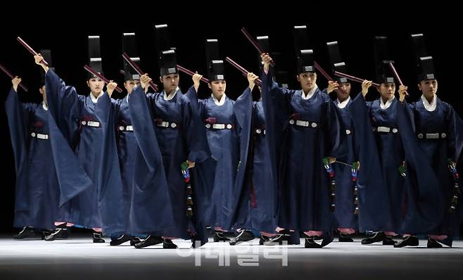 [이데일리 김태형 기자] 서울시무용단원들이 18일 서울 세종문화회관 대극장에서 열린 ‘일무’ 프레스콜에서 시연을 하고 있다.