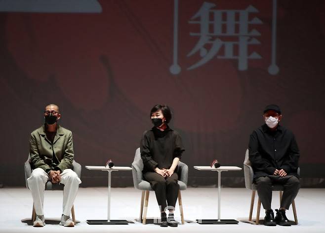 18일 서울 세종문화회관 대극장에서 열린 '일무' 프레스콜에서 정혜진 감독, 연출 정구호, 안무 김성훈씨가 기자간담회를 하고 있다.