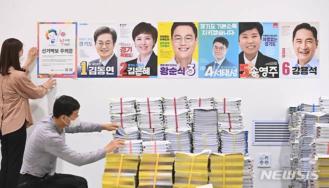 [수원=뉴시스] 김종택기자 = 제8회 전국동시지방선거 공식선거운동을 하루 앞둔 18일 오후 경기도 수원시 권선구 선거연수원 선거장비센터에서 관계자들이 각 행정복지센터로 발송할 선거벽보와 공보물을 점검하고 있다. 2022.05.18. jtk@newsis.com