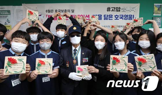 (수원=뉴스1) 김영운 기자 = 18일 오후 경기 수원 장안구 이목중학교에서 학생들이 호국보훈의 달 6월을 앞두고 경기남부보훈지청 주관 '빛을 담은 카네이션, 빛을 닮은 호국영웅!' 프로그램의 일환으로 직접 만든 카네이션 액자를 들고 6·25참전유공자와 함께 기념촬영을 하고 있다. 2022.5.18/뉴스1
