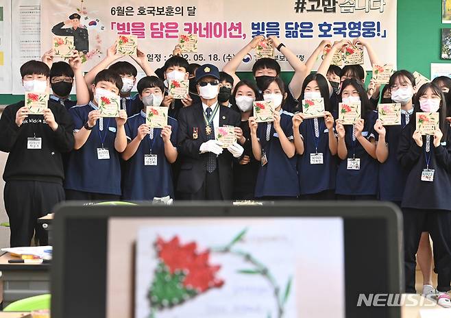[수원=뉴시스] 김종택기자 = 호국보훈의 달을 앞둔 18일 오후 경기도 수원시 장안구 이목중학교에서 학생들이 6.25 참전유공자에 대한 감사의 마음을 담은 카네이션 액자를 전달 한 뒤 기념촬영을 하고 있다. 2022.05.18. jtk@newsis.com