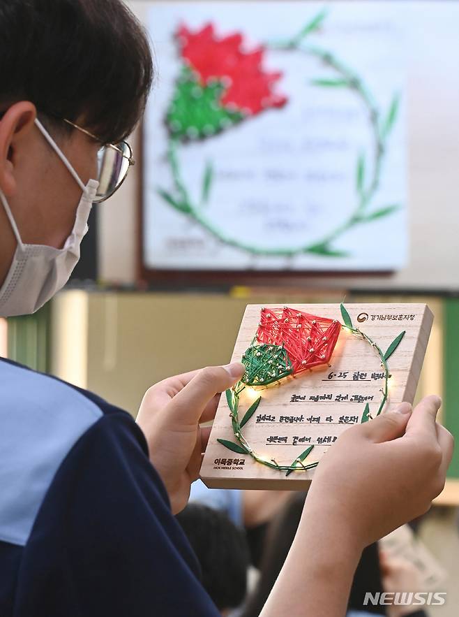 [수원=뉴시스] 김종택기자 = 호국보훈의 달을 앞둔 18일 오후 경기도 수원시 장안구 이목중학교에서 학생들이 6.25 참전유공자에 대한 감사의 마음을 담은 카네이션 액자를 만들고 있다. 2022.05.18. jtk@newsis.com