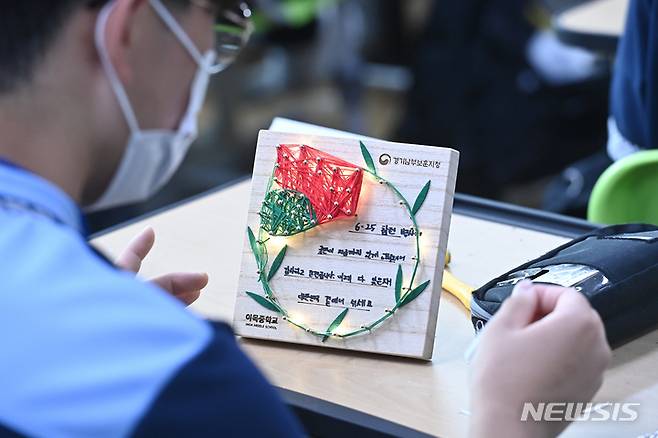 [수원=뉴시스] 김종택기자 = 호국보훈의 달을 앞둔 18일 오후 경기도 수원시 장안구 이목중학교에서 학생들이 6.25 참전유공자에 대한 감사의 마음을 담은 카네이션 액자를 만들고 있다. 2022.05.18. jtk@newsis.com