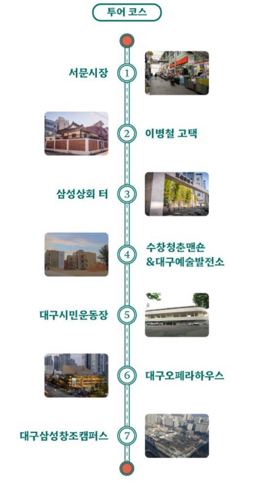 투어코스: 서문시장역 – 호암 이병철 고택 - 삼성상회 터 – 수창청춘맨숀, 대구 예술발전소, KT&G – 대구 시민운동장 - 대구 오페라하우스, 삼성 창조캠퍼스