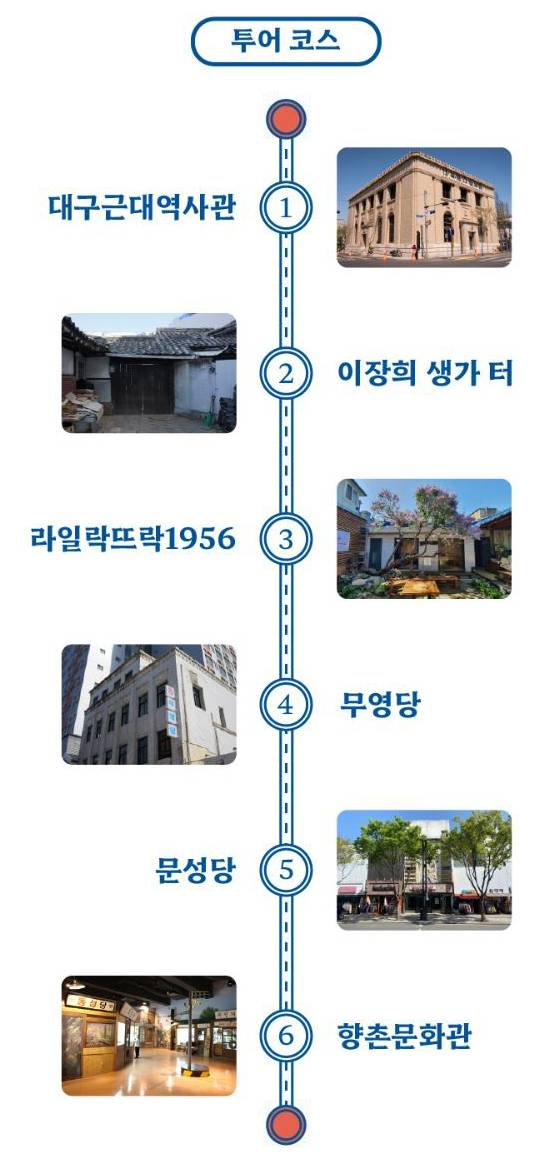 투어코스: 청라언덕역 9번 출구 – 청라언덕 - (구)제일교회(대구 제일교회 기독교 역사관) - 무영당 – 향촌문화관 & 녹향 - 대구 콘서트하우스 - 모루