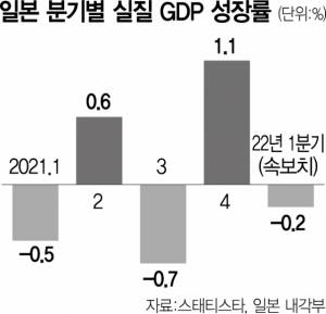 일본의 올해 1분기 국내총생산(GDP) 성장률이 2개 분기 만에 또다시 마이너스로 돌아섰다. 코로나19 오미크론 변이와 ‘엔저’ 현상이 성장률에 악영향을 끼치고 있는 것으로 나타났다.