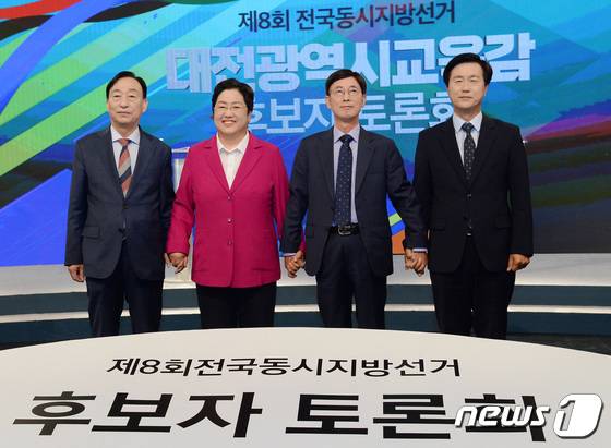 (대전=뉴스1) 김기태 기자 = 18일 대전 유성구 TJB 대전방송에서 열린 대전시교육감 후보 초청 토론회에서 설동호(왼쪽부터), 정상신, 김동석, 성광진 대전시교육감 후보가 토론회에 앞서 기념 촬영을 하고 있다. 2022.5.18/뉴스1