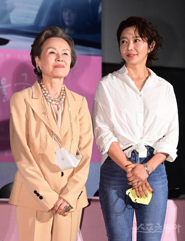 배우 정영숙과 조은숙이 18일 서울 광진구 자양동 롯데시네마 건대입구점에서 열린 영화 ‘인연을 긋다’ 언론시사회에서 인사하고 있다.