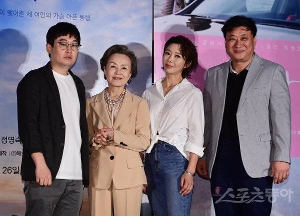 이정섭 감독, 배우 정영숙, 조은숙, 신준영 해오름이엔티 대표가 18일 서울 광진구 자양동 롯데시네마 건대입구점에서 열린 영화 ‘인연을 긋다’ 언론시사회에서 포즈를 취하고 있다.
