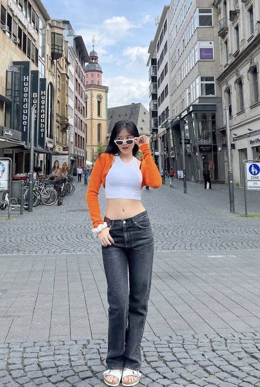 사진 속 안유진은 독일 거리에서 자연스럽게 포즈를 쥐하고 있으며 안유진은 크롭된 민소매 이너와 마찬가지의 크롭 오렌지 빛깔의 카디건을 걸쳐 상큼하면서도 아찔한 느낌을 자아내고 있다.